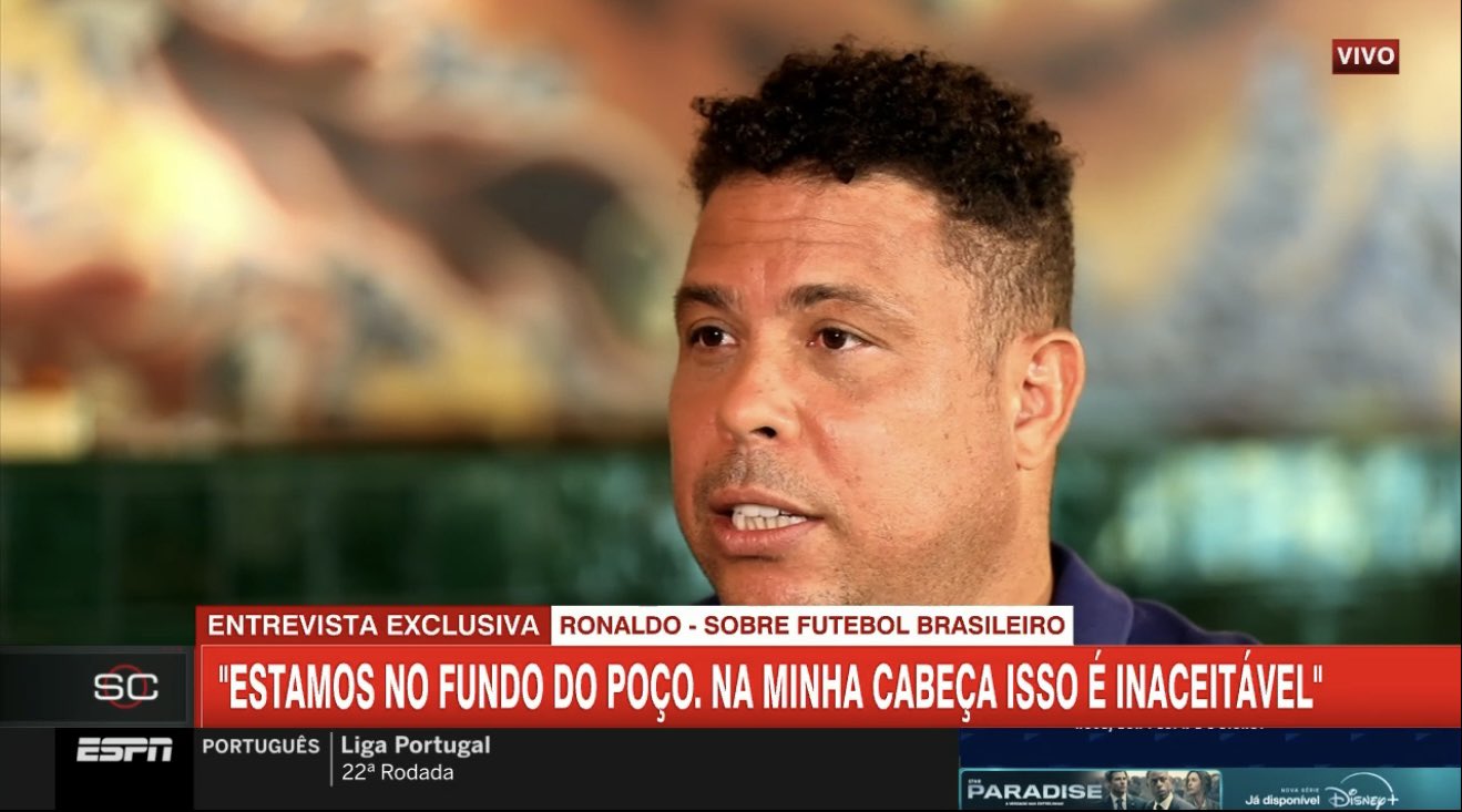 Em entrevista exclusiva exibida no programa Sports Center, do canal de TV fechado ESPN, Ronaldo Fenômeno voltou a falar sobre seu projeto de ser presidente da CBF. O ex-proprietário da SAF Cruzeiro e dono do clube espanhol Real Valladolid reforçou que pode melhorar o futebol brasileiro.
